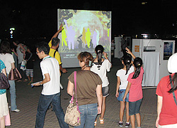 プロジェクトの成果発表の場として、金沢市役所前に設置された大型スクリーンを活用し、金沢の伝統工芸である加賀友禅の絵柄を、Kinectセンサーによって体を使って自由にお絵かきができる映像を通じて映し出し金沢の工芸の魅力をPRした。参加者がスクリーンに描いた絵はパソコンや携帯の壁紙としてダウンロードできるようになっており、インターネットを通して工芸作家との意見交換ができる場を提供していた。地域住民がプロジェクトの解決策に対して直接触れる場を構築することで、学生が制作したシステムへの感想や意見をいただくことが可能となった。一方で、加賀友禅をテーマとした様々な商品開発といった点においては、不特定多数の方々を対象としたプログラムの場としては、効果的な情報を得ることができなかった課題も残っている。テーマとなっている加賀友禅の作家とユーザーの連携による商品開発を実践するためにも、学生自身、コンセプトを明確にし、ユーザーのニーズを絞り込むなどの仕組みや機能の構築を図る必要があると実感していた。 |