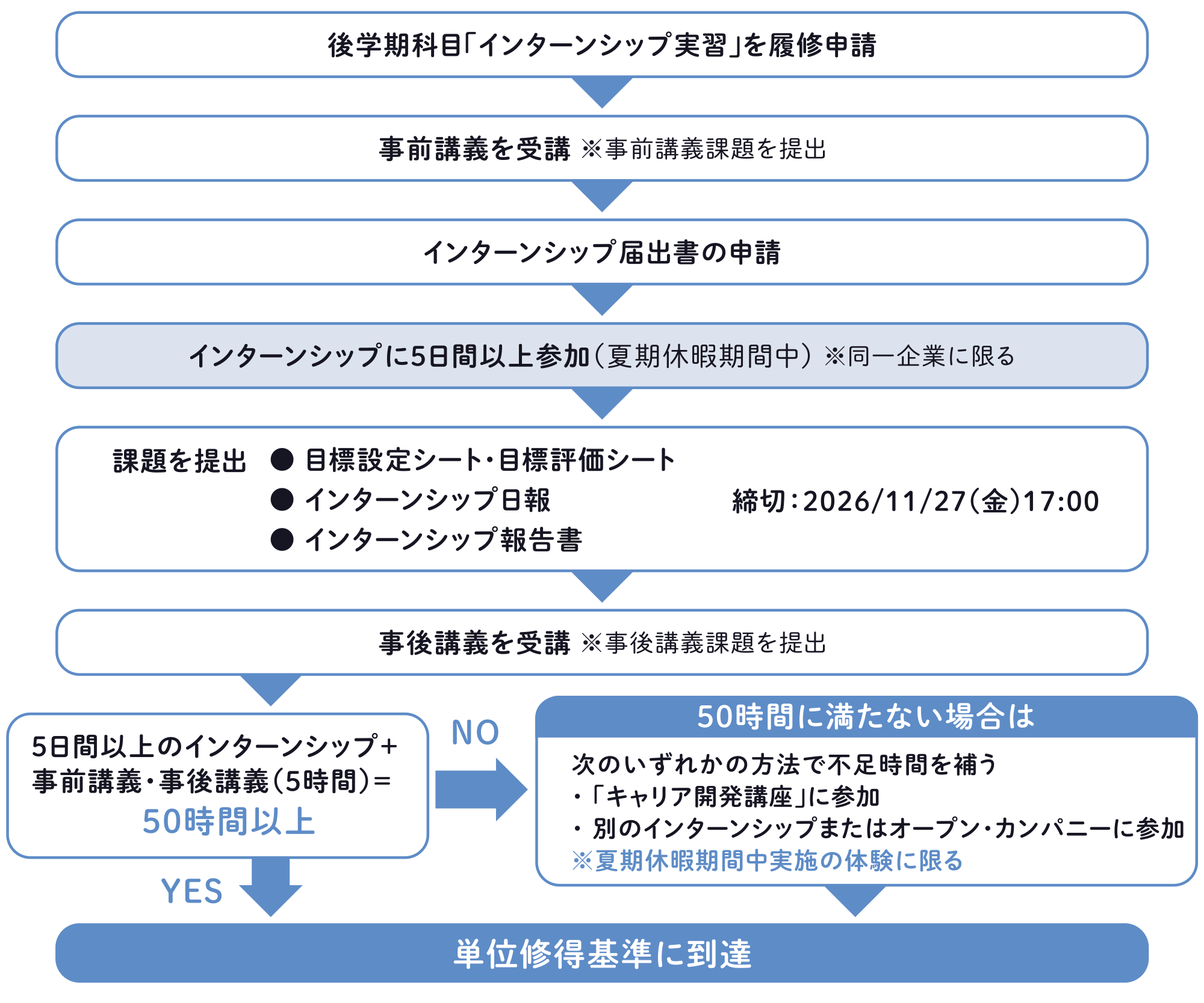 5日間以上のインターンシップと事前講義・事後講義の合計が50時間に満たない場合は、不足時間を「キャリア開発講座」に参加することで補うことができます。(当該年度の講座のみ学習時間に含めることができます)