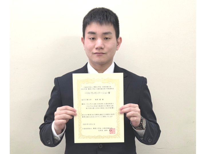 福原優さん(加藤秀治研究室)が精密工学会北陸信越支部 学術講演会「ベストプレゼンテーション賞」を受賞 -