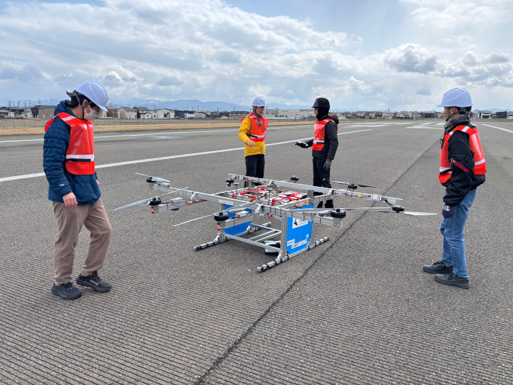 航空宇宙工学科 赤坂剛史教授が開発中の「50kg積載・50km超 飛行可能なVTOL型有翼電動ドローン」。2026年3月10日 福井空港にて飛行実験を実施