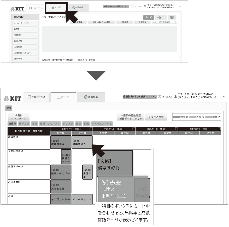 学生ポータルには、KITナビという機能があります。学生の皆さんが履修した科目が一目でわかるようになっています。