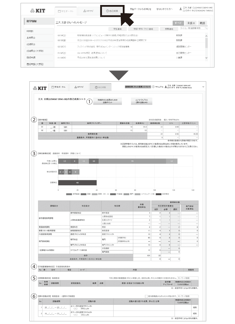 自己成長シートは、「学生ポータル」→上部タブ「自己成長」から参照できます。