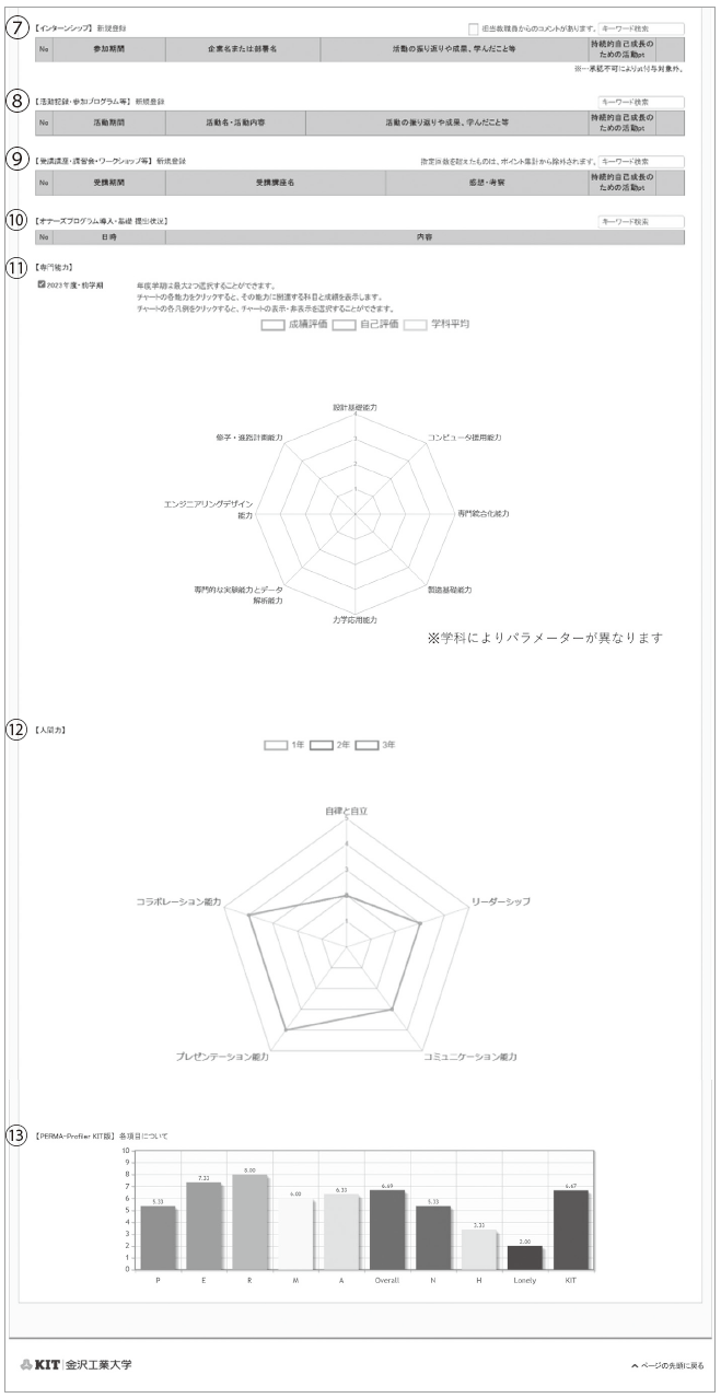 自己成長シートには、履修科目、成績、学長褒賞や資格取得の情報などが掲載されています。また、課外での活動状況を自身で入力することも可能です。定期的に確認・入力し、自己の成長を振り返り、今後のさらなる成長に繋げていけるようにしましょう。