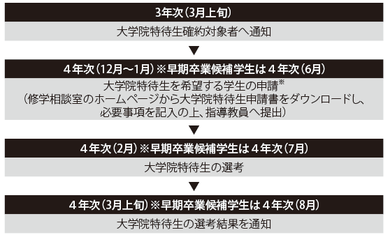 ※4年次(12月~1月)の時点で大学院進学を予定している方を対象に、事前確約対象者以外の方も含めた特待生の募集を行います。