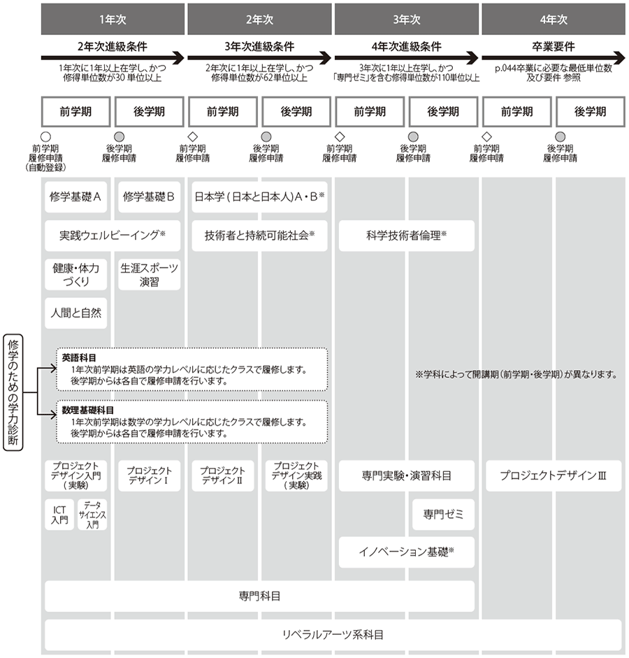 履修登録は学生本人の自己責任です。わからないことがあれば修学アドバイザーや教務課(1号館2階)に相談することができます。 - カリキュラムや各科目の詳細、卒業に必要な最低単位数などは、6.カリキュラムガイドに記載されています。