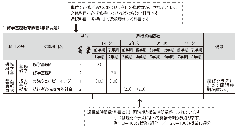 金沢工業大学規則集には、学部・大学院それぞれの「教育課程表」が掲載されています。これは本学の教育課程ごとに開講される授業科目と単位数、週授業時間数を一覧にした表で、履修計画を立てる上で非常に重要なものです。ぜひとも参考にしてください。以下に修学基礎教育課程の教育課程表の一部を例に見方を示します。