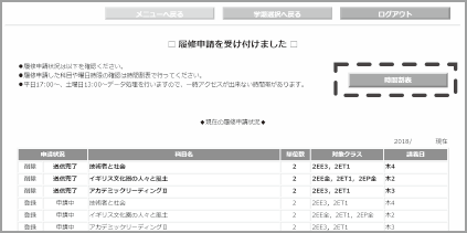 右上の「時間割表」を選択して、申請結果を時間割表で確認してください。
