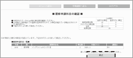 申請した科目がCAP制の上限(24単位)を超えた場合は、警告メッセージが表示され、申請ができません。