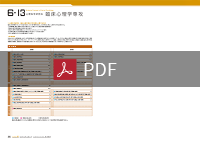 目標●臨床心理学的な諸現象を論理的かつ合理的に説明できる。最新の臨床心理学的な知識に関心を持ち、それらを修得する。研究会や学会などの学術的な活動に興味を持って積極的に参加し、討論に加わる。自身の研究が有する社会的な価値を意識し、一般の人々に自分の研究の意味を説明できる。研究成果をどのように社会に還元できるかを考える。臨床心理学的な知識と技能を備え、眼前の対象だけではなく社会全体に役立つ心理専門職を目指す。