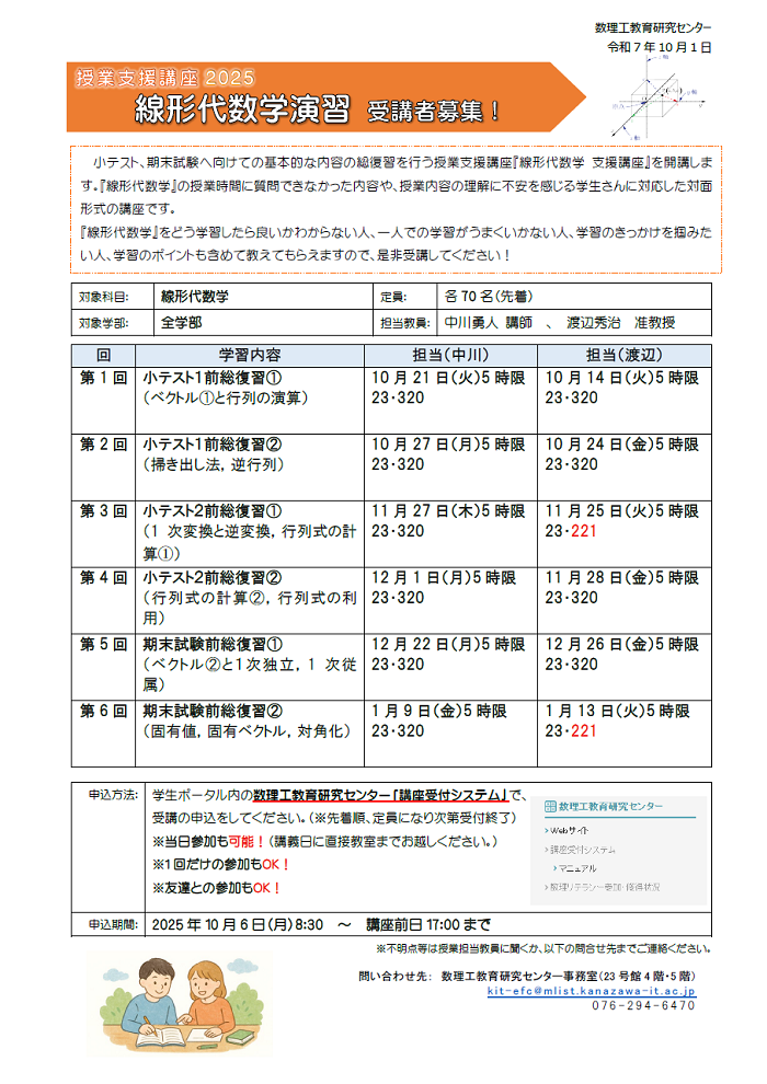 小テスト、期末試験へ向けての基本的な内容の総復習を行う授業支援講座「線形代数学演習」を開講します。「線形代数学」の授業時間に質問できなかった内容や授業内容の理解に不安を感じる学生さんに対応した対面形式の講座です。ぜひ受講してください。