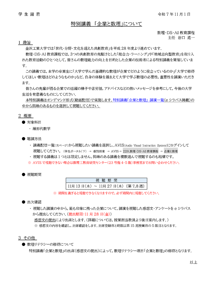 ≫≫≫特別講義「企業と数理」の講演一覧は こちらをご確認ください。(PDF)