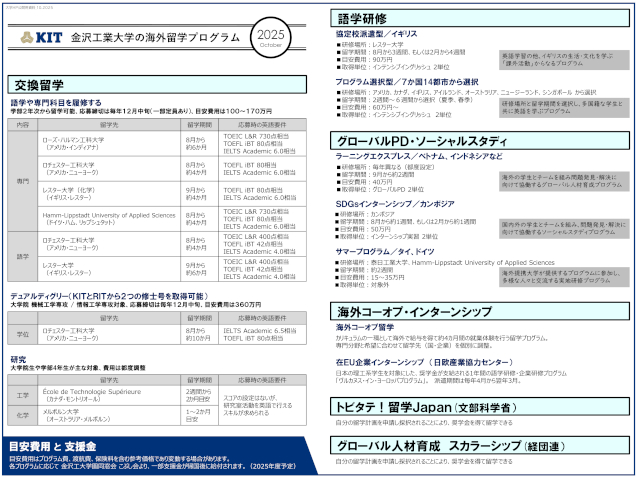 KITが協定を締結しているアメリカ・イギリス・ドイツにある4大学との「交換留学」など留学期間が4ヵ月以上にわたるプログラムから、夏休みや春休みを利用して参加できるプログラムまで、多様なプログラムを実施しています。
