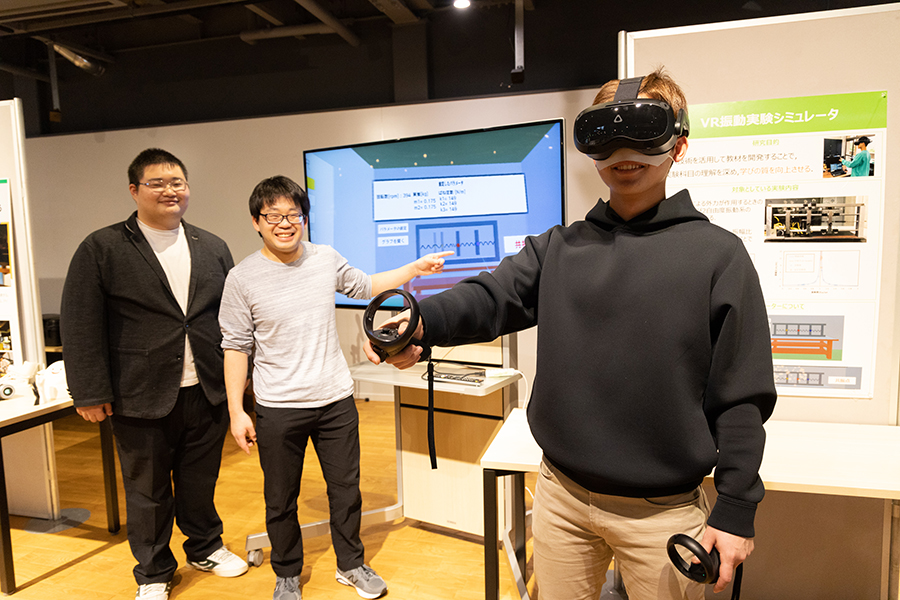 ロボティクス学科では、VR空間に実験室を用意。臨場感あるVR実験室で、時間外に誰でも自由に装置の操作方法を確認したり、繰り返し実験シミュレーションができる。危険事象も体験できるため、事故防止にもつながる。
