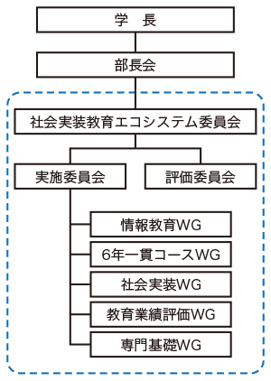 本事業は,これまでの本学の教育改革の延長線上にある取り組みであるため,本事業を実施する体制として,この「部長会」の直下に示す「社会実装教育エコシステム委員会」を設けることとします。この委員会は,「実施委員会」と「評価委員会」で構成し,事業計画責任者である副学長が委員長,事務局長が副委員長を務めることになります。予算については,学長,本委員会委員長および副委員長3名で配分を検討します。 「実施委員会」には5つのワーキンググループ(以下,WG)を設置し,その各々の委員と役割を次に示します。