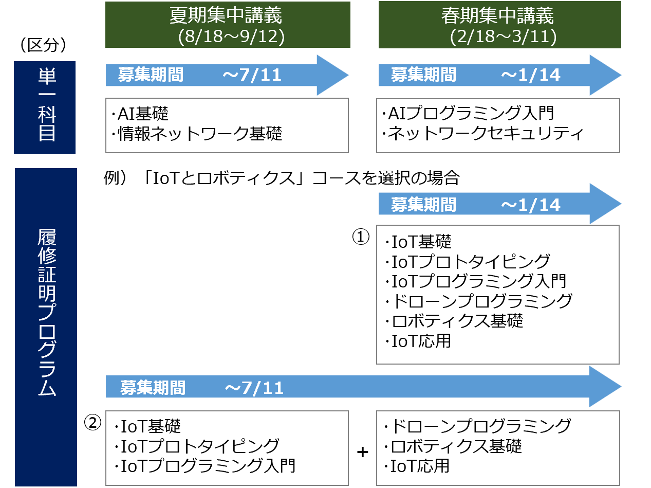 | IoT基礎 | IoTシステムを構成する基本技術や通信方式、情報セキュリティ対策技術について体系的に学習する。 | 基本的なコンピュータリテラシー(Windows/Officeの操作、タイピングなど)を修得していること。 | 【大学からパソコン貸与】 | 詳細 |