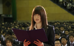石川学長による式辞、泉屋理事長による告辞、知的創造システム専攻6期生の竹上慎志さんによる来賓祝辞に続き、知的創造システム専攻の佐古めぐみさんが新入生を代表して宣誓を行いました。