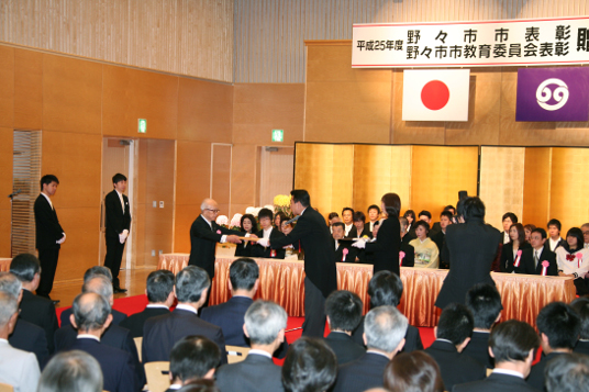平成25年度野々市市表彰贈呈式が11月3日(日)9時から野々市市情報交流館カメリアで行われ、夢考房ロボットプロジェクトと奥村善久 金沢工業大学名誉教授が粟貴章 野々市市長から野々市市特別栄誉表彰を贈呈されました。