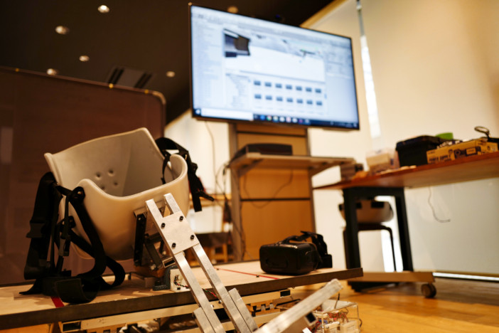 障がい者スポーツの普及に貢献するため、ロボティクス学科と機械工学科の学生が製作したのがVR型チェアスキーシミュレータです。仮想空間の斜面と連動して実空間の台座も動くため、より臨場感が味わえます。季節や環境に左右されず、誰もがチェアスキーを楽しむことができるほか、各種の展示会やイベントで多くの人たちに体験してもらったことが評価され、第21回バリアフリー社会推進賞 福祉用具部門 最優秀賞を受賞しています。