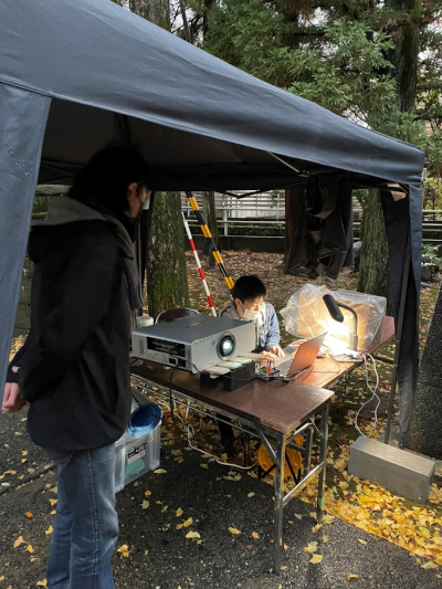 今回、プロジェクトが北國街道野々市の市実行委員会の協力を得て開催した「布市神社プロジェクションマッピングイベント」は、現在はコロナ禍で中止されている野々市市の伝統行事である獅子舞や野菜みこしの過去の映像を利用し、最新の映像技術によって「見ているだけでワクワクする。」だけではなく「地元の伝統行事も疑似体験できる。」ように工夫した映像を、プロジェクターで布市神社の拝殿に投影しました。野々市市本町周辺の活性化といった目的に加え、金沢工業大学がめざすSociety5.0に向けた地域の新しいタイプの仮想交流を創出して、参加した住民の皆さんにも好評を得ることができました。