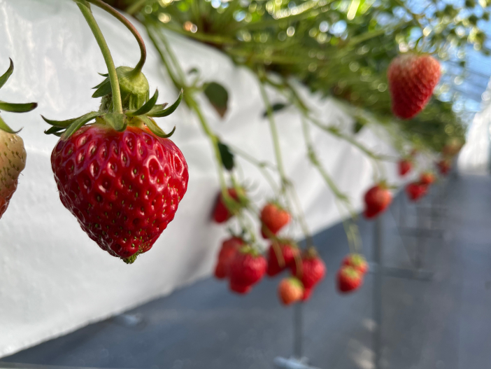 さらに金沢工業大学白山麓キャンパス内には研究用いちご農圃を設置。再生可能エネルギーを用いたカーボンニュートラルないちご栽培を実現するとともに、5Gやロボット工学を用いたいちごの摘果ロボット開発等も行われています。