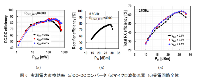 本発表のDC-DCコンバータは0.25μm高耐圧BCDプロセスを、提案マイクロ波整流器は0.5μm GaAsプロセスを用いて試作しています。図4にそれぞれのチップ写真を示します。図5にVOC予測動作によるMPPT制御の様子を示します。2.67msという短い間隔でVOC予測回路が動作し、VOC情報を更新しています。また、VOC予測動作によりMPPT時間は45.2μsとなっており、これは無線電力伝送向け受電回路として世界最速です。これにより高速に変動するマイクロ波電力に無駄なく追従することが可能になります。また、図6(a)にDC-DCコンバータ、図6(b)にマイクロ波整流器、図6(c)にDC-DCコンバータとマイクロ波整流器を接続した受電回路全体の電力変換効率測定結果を示します。DC-DCコンバータ単体とマイクロ波整流器単体の最高電力変換効率はそれぞれ86.4%と78.5%であり、受電回路全体では最大64.4%となりました。これはICチップの受電回路として世界最高の電力変換効率です。