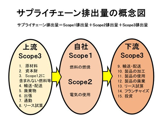 製品の原材料調達から製造、販売、消費、廃棄に至るまでの過程において排出される温室効果ガスの量のこと。Scope1(自社での直接排出量)、Scope2(自社での間接排出量)、Scope3(それ以外の間接排出量)からなる。