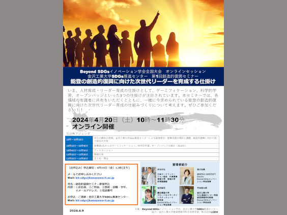 【金沢工業大学SDGs推進センター 第1回創造的復興セミナー】 Beyond SDGsイノベーション学会全国大会オンラインセッション「能登の創造的復興に向けた次世代リーダーを育成する仕掛け」を4月20日にオンライン開催
