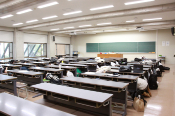 本訓練は、「緊急地震速報」を受け、震度5強の地震が発生した想定で実施され、「机の下に入って頭を守る」行動をとるとともに、揺れが収まったあと指定する避難場所に安全に移動するもので、大学としての安全管理体制の強化と、危機対応力の向上を目的としています。