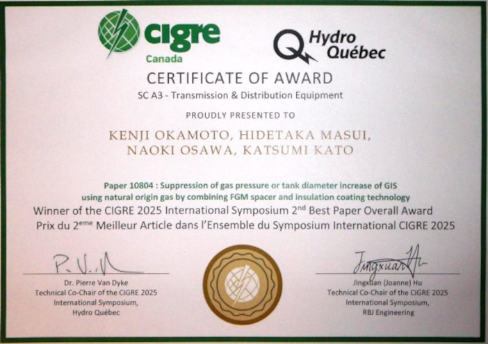 受賞した論文名は『Suppression of gas pressure or tank diameter increase of GIS using natural origin gas by combining FGM spacer and insulation coating technology』です。