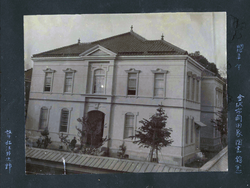 石川県の公共図書館は、明治12年(1879)、石川県勧業博物館内に図書室を設置し、前田家蔵書3万余冊を中心に公開したことに始まる。明治36年に図書室を新装したとされることから、この写真は新築された勧業博物館図書室のことで、前田家図書館と呼ばれていたようである。設計者は松任外次郎と記されている。明治41年(1908)、前田家の希望により蔵書を返却することになり、勧業博物館図書室は閉室された。しかしこれがきっかけとなり、長谷川邸跡(現時雨亭付近)の石川県物産陳列館の隣に、県立図書館が設置されることになった。