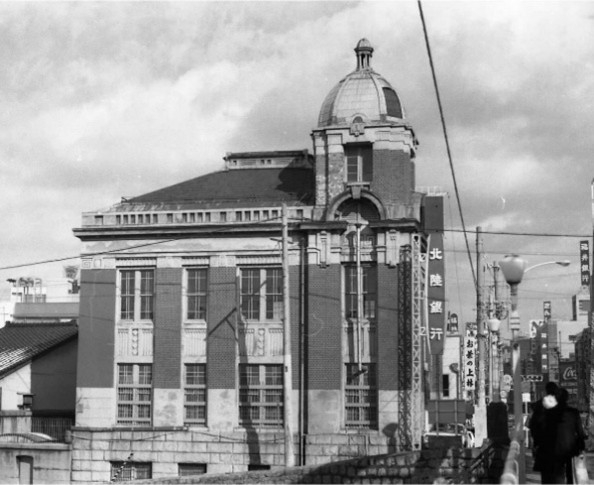 金沢貯蓄銀行犀川支店は大正9年(1920)、田辺満一の設計により建設された。犀川大橋北詰に位置し、木造タイル貼りの2 階建てで角にドーム型屋根の尖塔が建つ、ランドマーク的な建物であった。写真手前の欄干は、鉄筋コンクリート製の犀川大橋のもので、完成後に現在の犀川大橋が架けられる。昭和18年(1943)、金沢貯蓄銀行は北陸銀行に合併された。老朽化により、昭和48年(1973) 12 月に取り壊された。