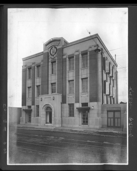 大正13年(1924)6月、白銀町に北陸で初めての3階建貸ビル金沢万歳ビルディングができた。万歳生命保険株式会社金沢支部が入居していた。万歳生命は昭和4年(1929)、日華生命保険と合併し、日華万歳保険に改称した。万歳生命は設立間もなく、実業家・渋沢栄一が相談役を務めていた。場所は白銀町の通りの南側にあり、写真では道路に市電の線路が確認できる。