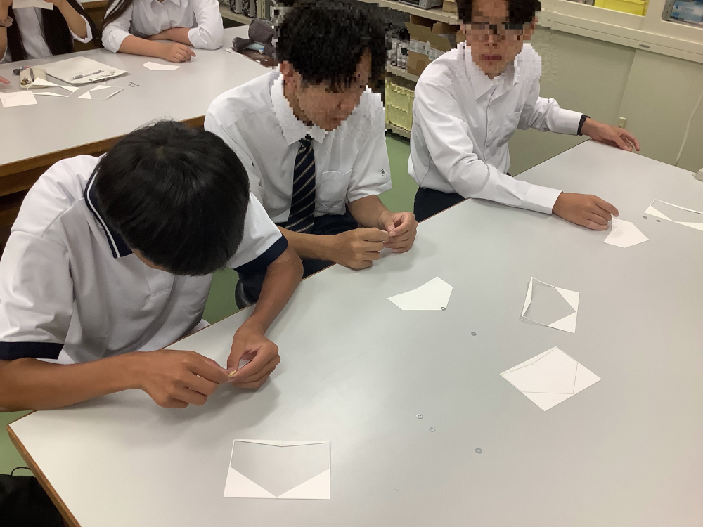 授業の始め、森吉助教から「よく飛ぶ紙飛行機が完成するには何が必要?」と問いかけがありました。生徒たちは翼の形や材質、投げ方などいろいろと意見を出し合いながら、紙飛行機について深く議論をしあいました。森吉助教からは、航空機力学の基本概念である揚力・抗力などの空気力学と重力によるつり合いの説明がありました。さらには風洞実験による迎え角と空気力の実演を通して視覚的に風と翼の角度によって発生する空気力の変化を確認する演習が行われ、紙飛行機が飛行するときにどのような物理的な法則が働いているか理解を深めました。