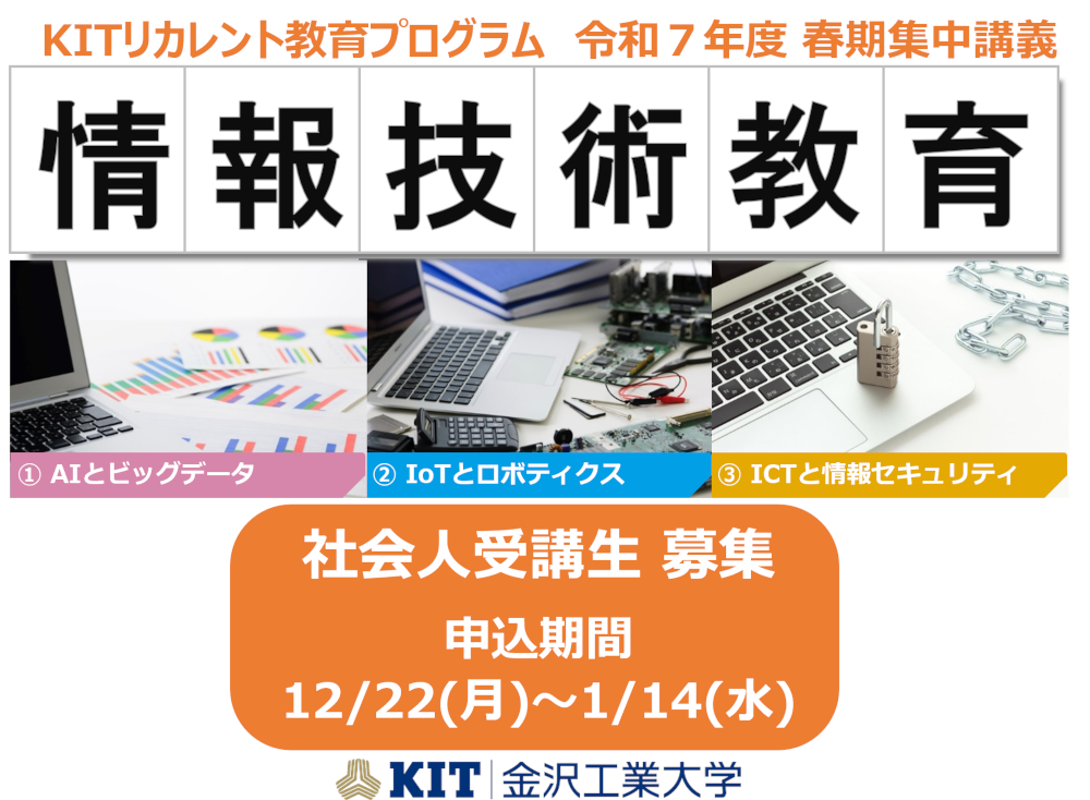 金沢工業大学では、社会人が学生や教員と共に学び合う「KITリカレント教育プログラム」の募集に先立ち、ホームページにて情報を公開しました。募集は12月22日(月)より開始します。2~3月の春期集中講義期間にAIやIoTを中心とする「情報技術教育プログラム」13科目を開講します。
