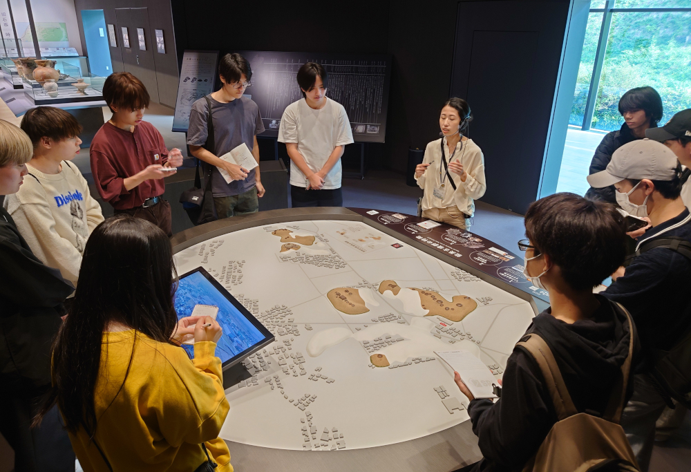 能美ふるさとミュージアムは、国指定史跡能美古墳群の貴重な出土品など、能美の自然や歴史、民俗などを楽しく学ぶことができる体験型ミュージアムです。田中教授が研究テーマとしている博物館学習の一環で能美ふるさとミュージアムと連携していたことがきっかけで、2023年度から学生たちによるイベント共催を実施。昨年の共催イベントは好評を博し、今年度もイベント共催をするに至りました。今年度も学生が能美ふるさとミュージアムで視察とヒアリングを実施。課題解決として「イベントのにぎわい創出」を目指し、今回のコラボイベントが実現しました。「プロジェクトデザイン実践」第2回目では、能美ふるさとミュージアムの学芸員の方からの説明を受けながら、実際に見学しました。