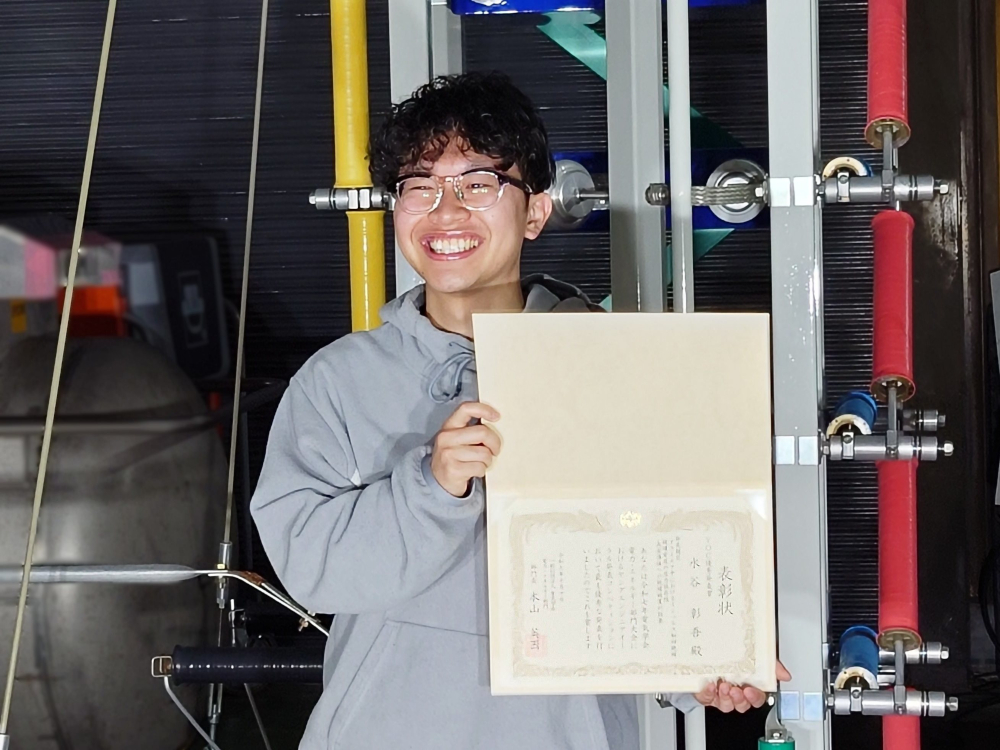 大学院電気電子工学専攻1年の水谷彰吾さんが電気学会電力・エネルギー部門大会で「YOC優秀発表賞」受賞