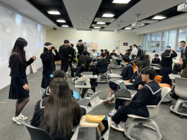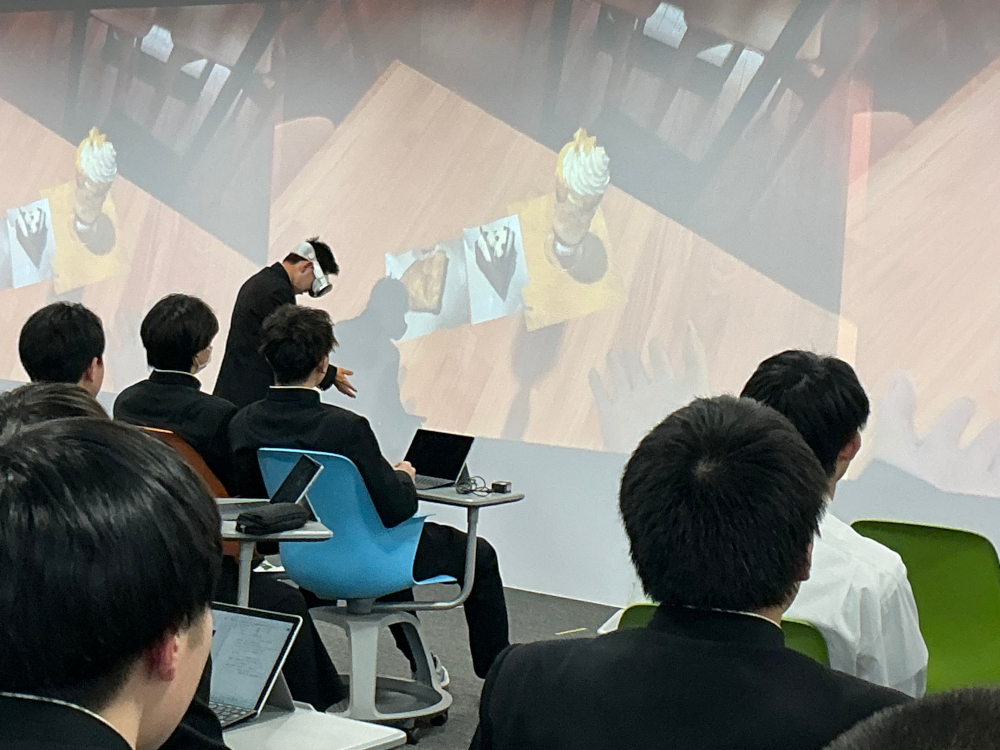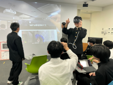 その後、生徒たちは6チームに分かれ、「Vision Pro」を実際に装着し、3年生が制作したコンテンツを体験しました。生徒たちは、360度撮影された月山の風景映像をVRモードで体験し、頭の動きに合わせて画面の視点が連動するヘッドトラッキング機能を体感しました。また、指をつまむ動作(タップに相当)で操作する Vision Proの基本操作を確認しました。初めてVRを装着する生徒もいて、空間でタップする操作に戸惑っている姿も見られましたが、柔軟に対応をし、没入感のある映像体験に歓喜が湧き起こりました。この体験を通じて、生徒たちは、3次元CGの技術が最新デバイス上でどのようにリアルな没入感(VR)や拡張現実(AR)を実現しているかを具体的に理解し、情報技術の未来への関心を深めました。