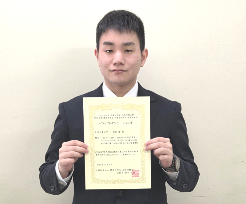 2025年12月6日に石川県地場産業振興センターで開催された「2025年度 精密工学会 北陸信越支部 学術講演会」において、金沢工業大学大学院 工学研究科 機械工学専攻 博士前期課程1年の 福原優さん(加藤秀治研究室)が、ベストプレゼンテーション賞を受賞しました。