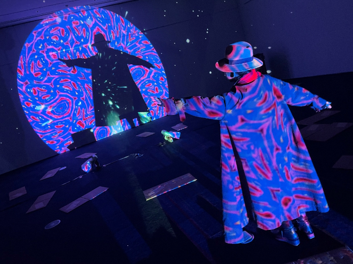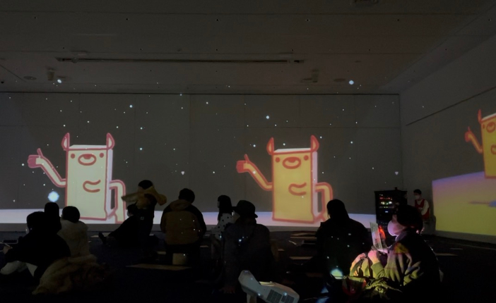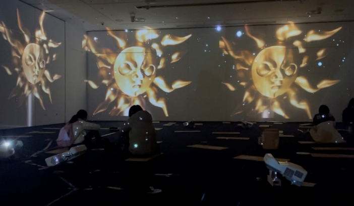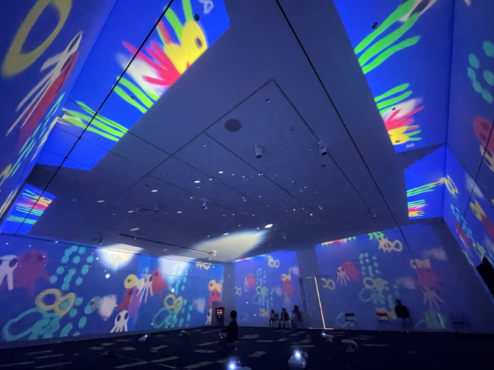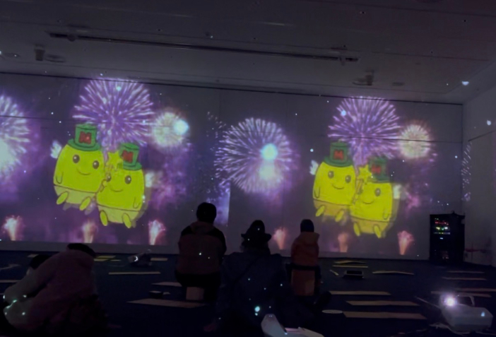 会場内は、高性能プロジェクターにより壁・床・天井の全方位に映像を投影し、異次元の没入感(イマーシブ)を演出。学生たちが外部機関と連携して制作・構成した計15作品が、来場者を圧倒しました。