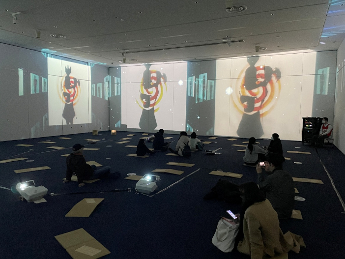 日本を代表するデジタルアーティストであり、プロジェクションマッピングの創始者として知られる長谷川章先生の最新作。幾重にも重なる躍動するプロジェクションアート画面と鑑賞者の能動的な参加により映し出される影が合わさって完成する参加型の作品。子供さんを中心に大人気の作品となりました。