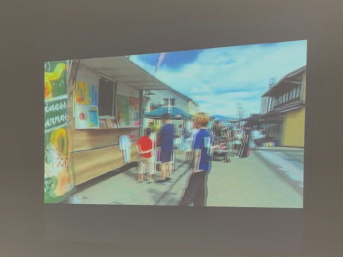 松林研究室の学生が地元AIデジタルクリエーターの中田明秀氏(ディーセントワーク社長)と企画、製作した作品。野々市市内54町会の町会長へのインタビューと各町会の現地取材に基づいて54町会の魅力をオムニバス形式で紹介するコミカルなインスタレーション。
