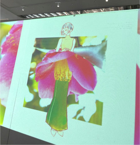 石川県と東京都を拠点に世界で活躍するイラストレーターのやちゆうな氏の作品。自然の花々をそのままドレスとして纏う愛らしく美しい女性のイラストを中心としたインスタレーション。