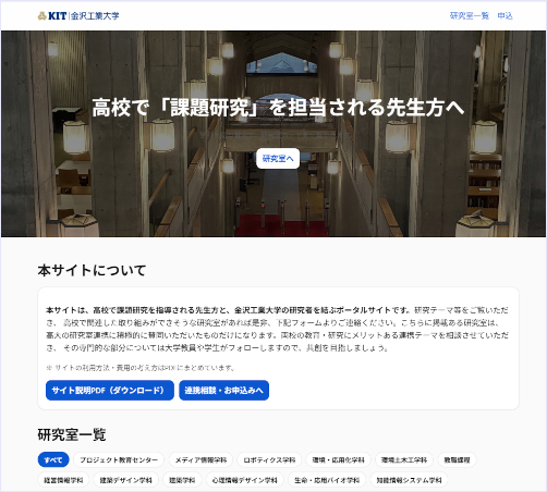 文部科学省が構想する高校教育改革に関する基本方針(グランドデザイン)により、専門高校における課題研究の重要性が高まる中、「実社会と繋がるテーマを作りたい」「専門的な助言がほしい」といった声が多く聞かれます。こうしたニーズに応えるため、金沢工業大学では、高校教員向けに「課題研究シーズ集」を公開しました。