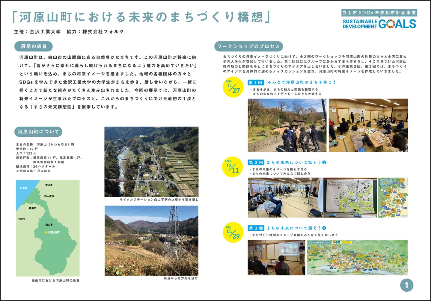 河原山町は、白山市の山間部にある自然豊かなまちです。この河原山町が将来に向けて、「皆がさらに幸せに暮らし続けられるまちになるよう魅力を高めていきたい」という願いを込め、地域住民と金沢工業大学の大学生がまちを歩き、話し合いながら、まちの将来イメージを描きました。河原山町の将来イメージが生まれたプロセスと、河原山町の「いま」をみつめ「これから」についてみんなで話し合った中から生まれた、これからのまちづくりに向けた最初の1歩となる「まちの未来構想図」をご紹介します。