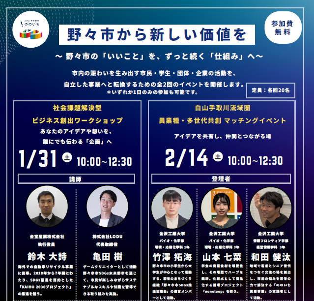 2月14日(土)10:00~12:30 白山市手取川流域圏 異業種・多世代共創 マッチングイベント