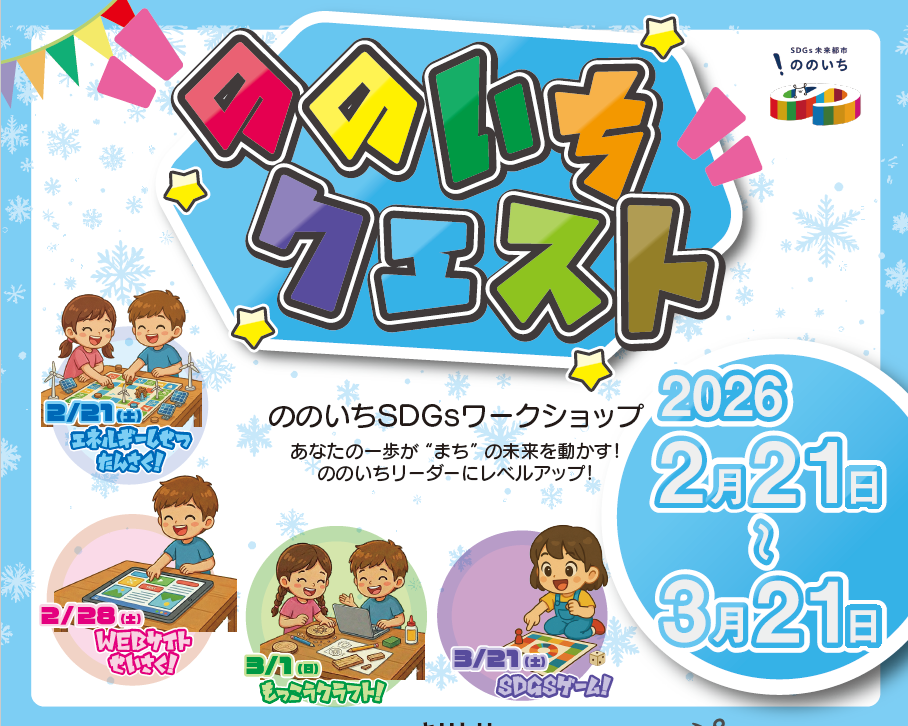 野々市市主催のSDGs体験イベント「ののいちクエスト」が開催されます。本イベントは、ののいちの未来をつくることを目的として2月から3月にかけて4つのイベントが開催されます。興味のあるテーマのイベントにぜひご参加ください。