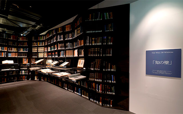 「稀少本」コレクションの心臓部「知の森」。ここでは、科学的発見、技術的発明は常に先人たちの成果が、次世代の科学者たちに影響を与え、その歴史は「知の連鎖」であるということを分野別に系統だててご紹介しています。会場中央に配した「カテゴリーモニュメント」のガイドラインに従って、来場者は、会場の番号の案内に沿ってカテゴリー別に順に「稀少本」閲覧していきます。