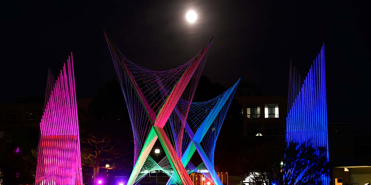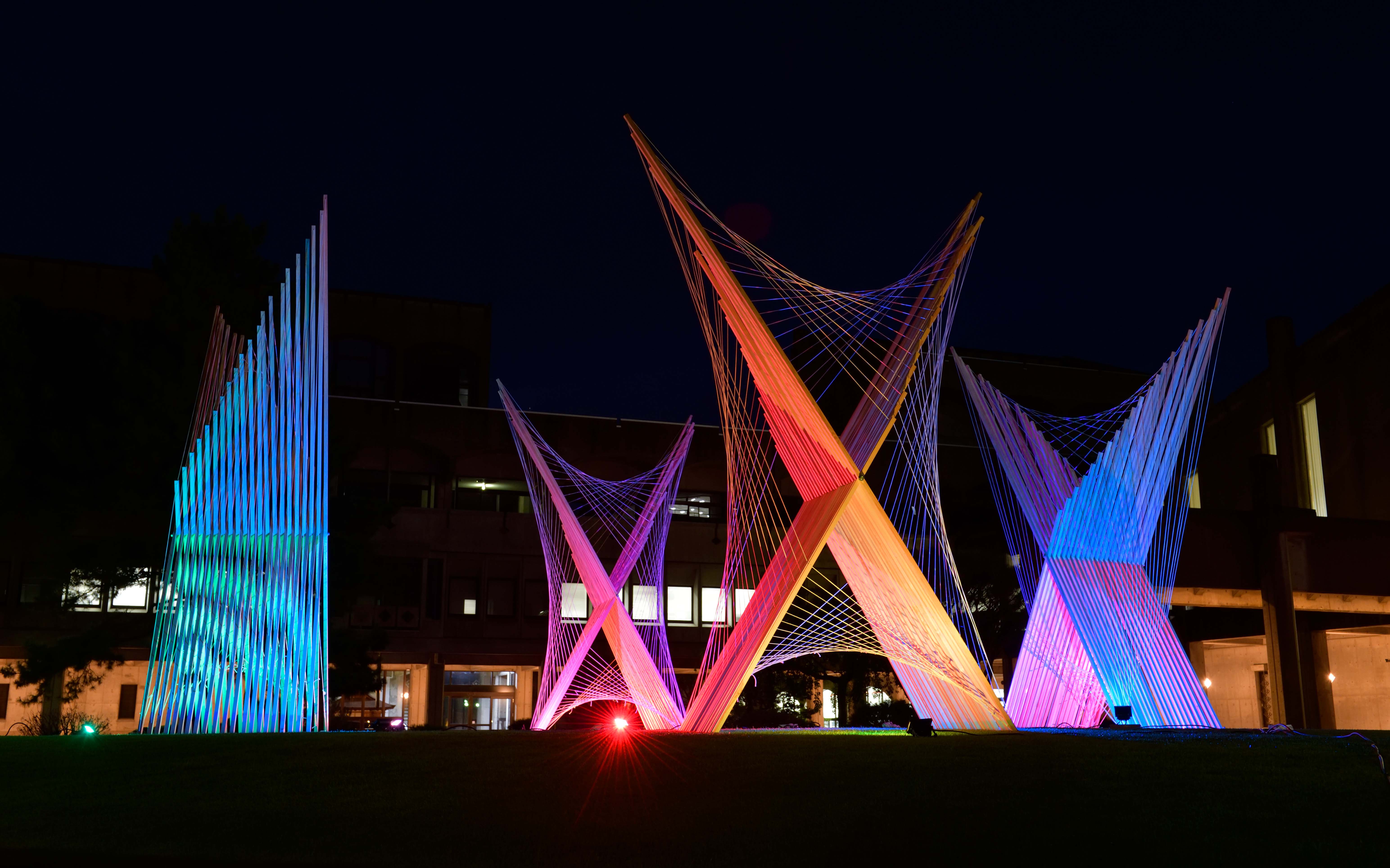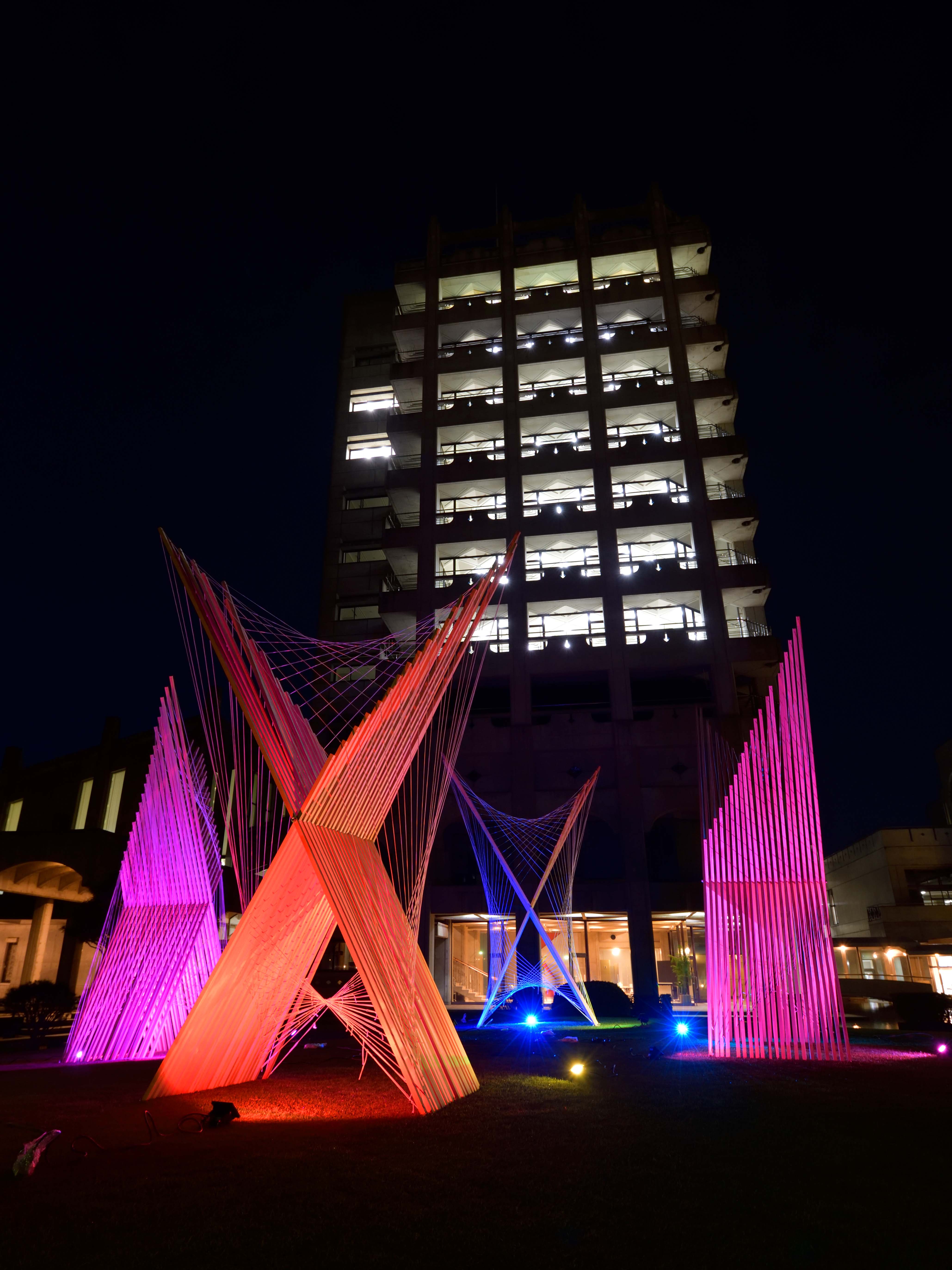施工はシンプルな工程の繰り返しのはずでしたが、木材がゆがんだために留めるボルトの位置を調整したりするなどやってみないと分からない問題もあるのだと気づきました。施工スケジュールを管理していましたが、グループのメンバーはまとまりも良く予定通りにオブジェを完成する事ができました。途中、ライトをあてたらどう見えるかテストはしていましたが実際、会場でライトをあてて見た時は自分たちが思っていたより成功していたので良かったです。実は、ちゃんと建つかも不安だったので…。