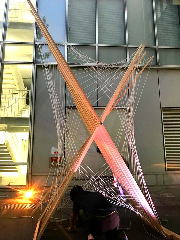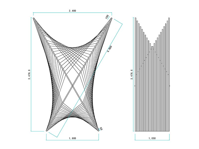 ハサミ状の骨組みを連ねたシザーズ構造と双曲放物面状に張られた紐を上下、側 面に組み合わせて安定化させる構造オブジェを設計しました。