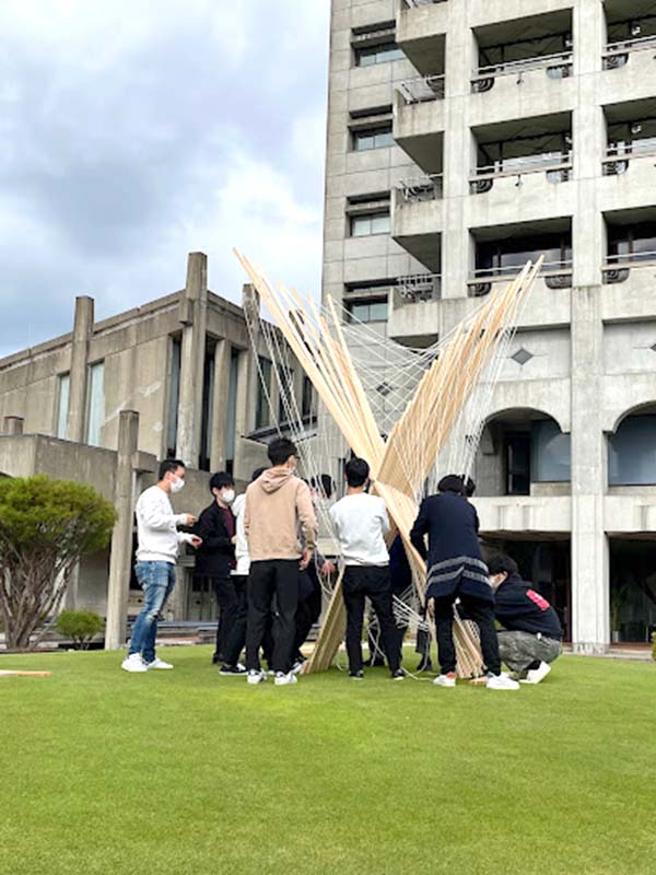 建築物の構造を学んでいるので、デザインに構造を活かし、きれいに見えるオブジェを製作しました。ハサミ状の骨組みを組み合わせるシザーズ構造を利用してデザインを考え、骨組みに紐を組み合わせ、オブジェの上下に2次曲面が出来るようにしました。デザイン自体の製作には、3Dモデリングソフトウェア「SketchUp」を使いました。シンプルな作りなので、オブジェに迫力を持たせるため、「ライノセラス」を使い施工途中で大きさの調整を行いました。